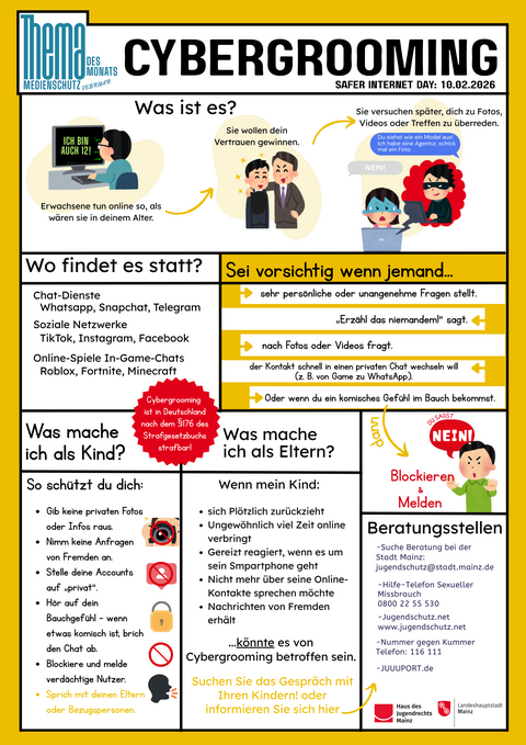 Der Februar steht außerdem im Zeichen des Safer Internet Day, der weltweit auf mehr Sicherheit im Netz aufmerksam macht. Vor diesem Hintergrund erklärt das Plakat altersgerecht, wie Cybergrooming funktioniert, welche Warnsignale es gibt und mit welchen einfachen Schritten man sich schützen kann.