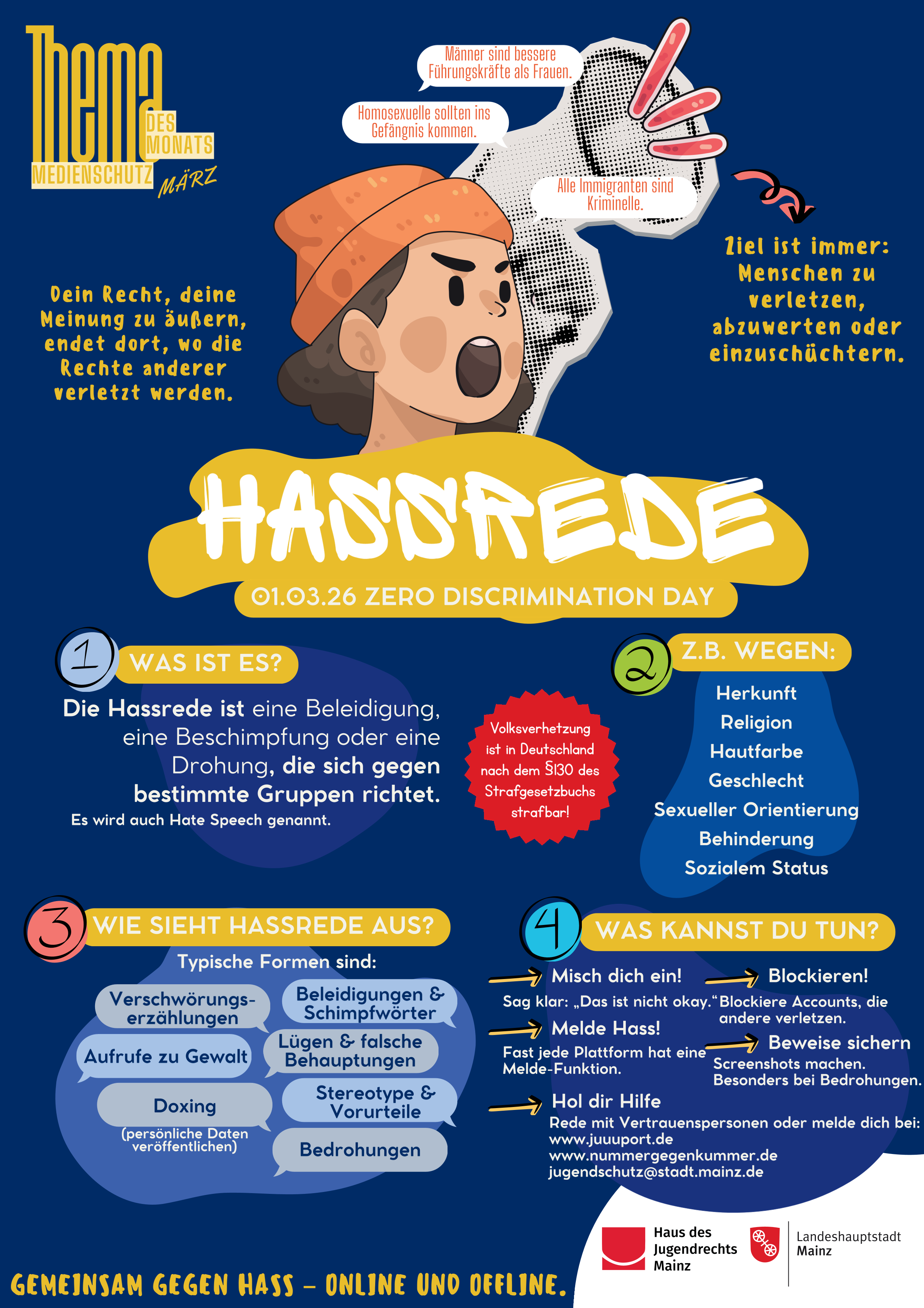 Im März rückt unser Infoplakat das Thema Hassrede in den Mittelpunkt – ein Problem, das viele junge Menschen täglich in sozialen Netzwerken, Chats oder Online-Games erleben. Unter Hassrede werden abwertende Kommentare, Beleidigungen oder Drohungen verstanden, die sich gezielt gegen bestimmte Gruppen richten und Menschen verletzen sollen.